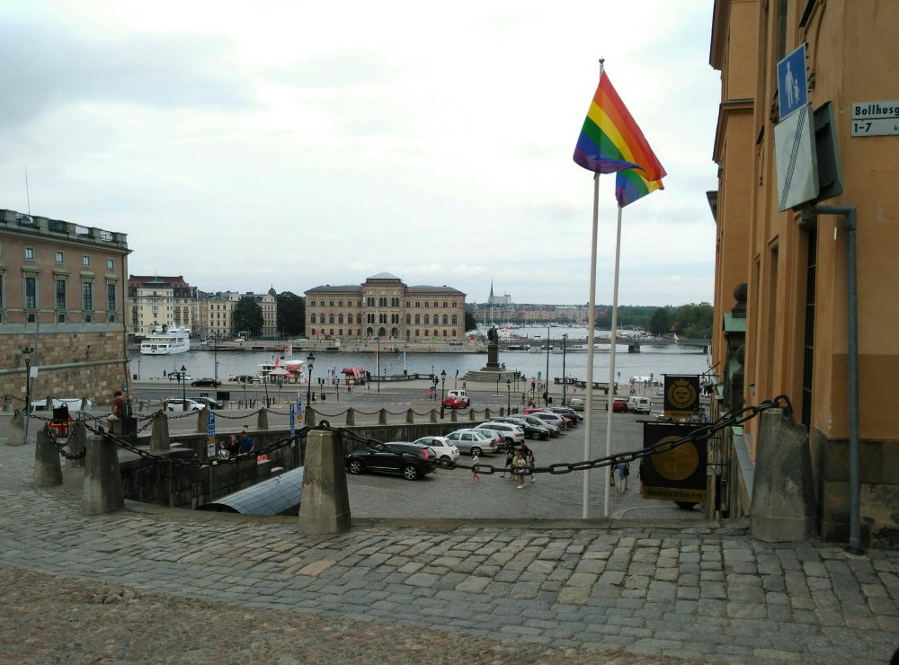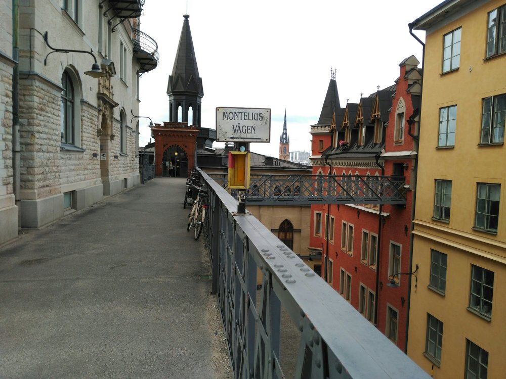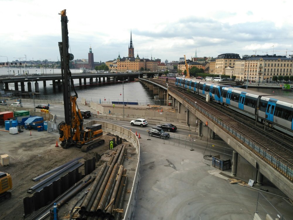 Und dann ist da dieser geniale Platz: Das Eken hinter dem Slussen am Hilton zwischen Autobrücke und Fußweg am Brückenende. Unter mir kreuzen Bahngleise über der Baustellenstraße, führen über den Mälar und enden auf der anderen Seite unter der anderen Autobrücke unter der Stadt, aber über dem Mälar. Hier kreuzen alle Wege zwischen Norrmalm und Södermalm. Von allen Seiten fließt es um das Eken herum: Leute, Radler, Autos, Züge, Busse, Schiffe, Kräne, Wasser, Wolken.