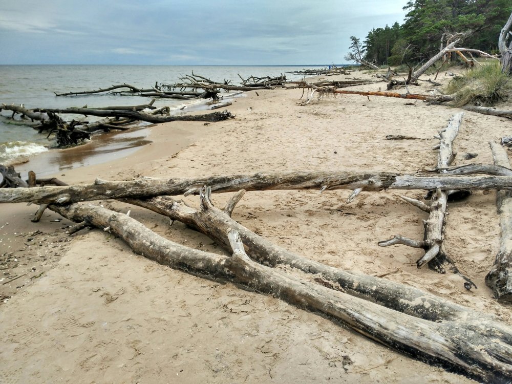 Umgefallene Pinien säumen den Strandweg zum „Kempings“. Schaurig schön!