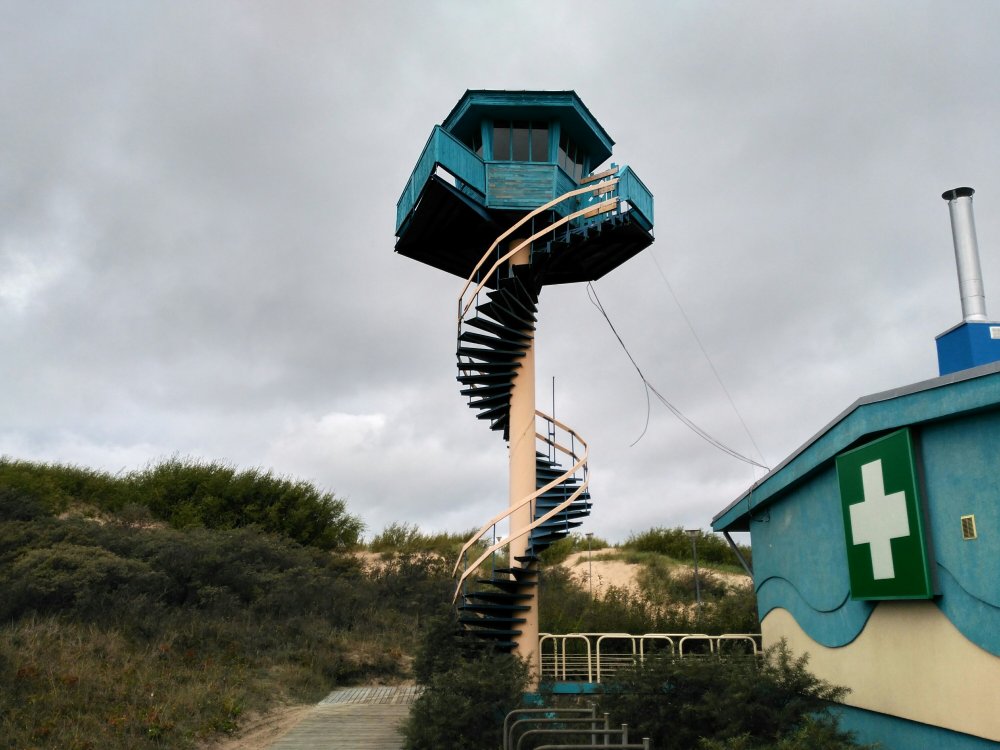 Der Aussichtsturm ist abgesperrt, denn das Geländer ist kaputt. Es ist jetzt nunmal Nachsaison und der gigantische Blaue-Flagge-Strand morgens fast menschenleer. Aber dieser endlose Strand hier ist wirklich schön! Endlich mal wieder richtige Wellen und das Wasser ist mit 19° wärmer als die Luft. Ich gehe trotzdem nicht baden…