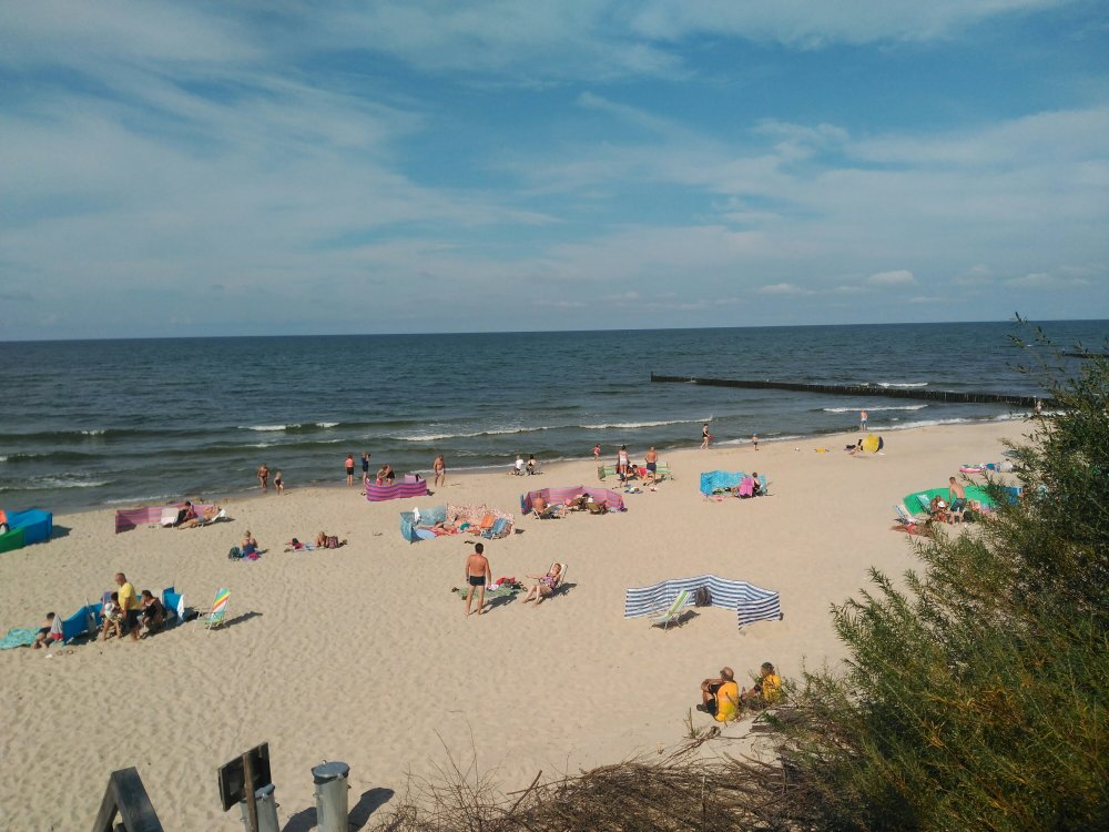 Die Landschaft ist der Hammer! Die Strände weit …und bunt (sie bauen hier ALLE diese Windschützer auf). Polnische Männer tragen gern das T-Shirt über dem Bauch hochgezogen auf Halbmast. Dabei zeigen sie ihre Brüste. Das sieht gar nicht gut aus.