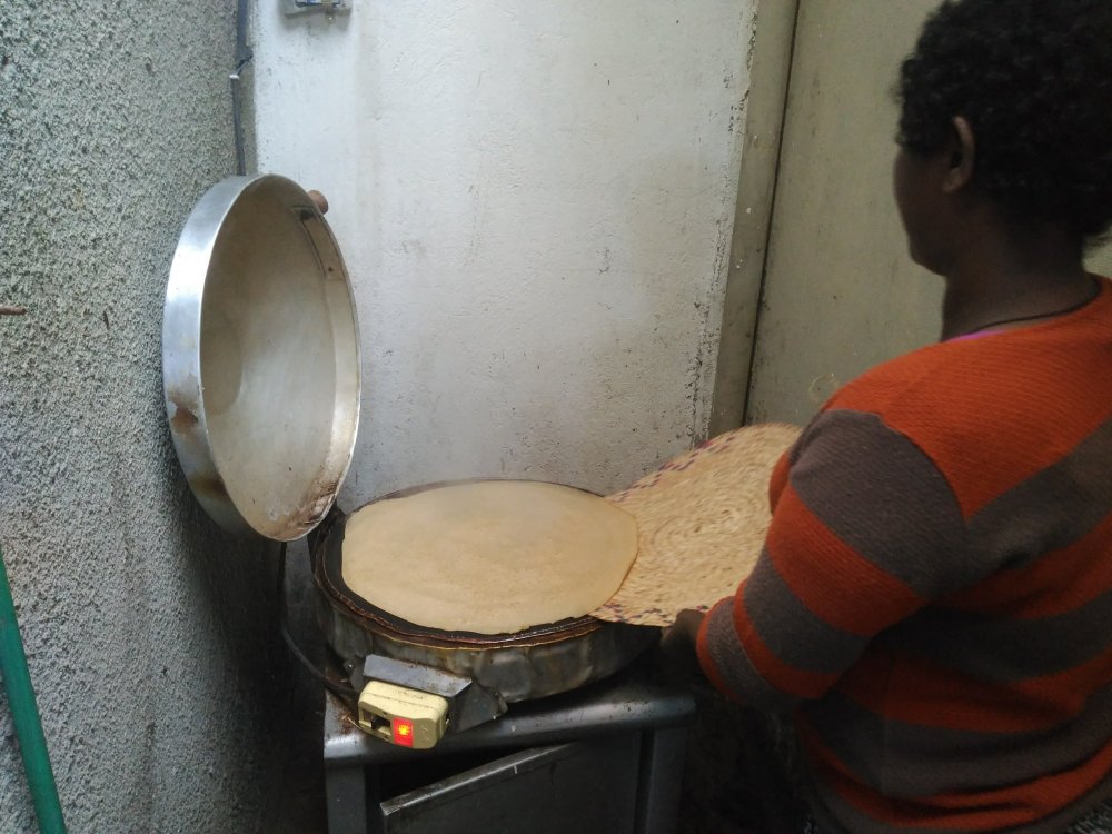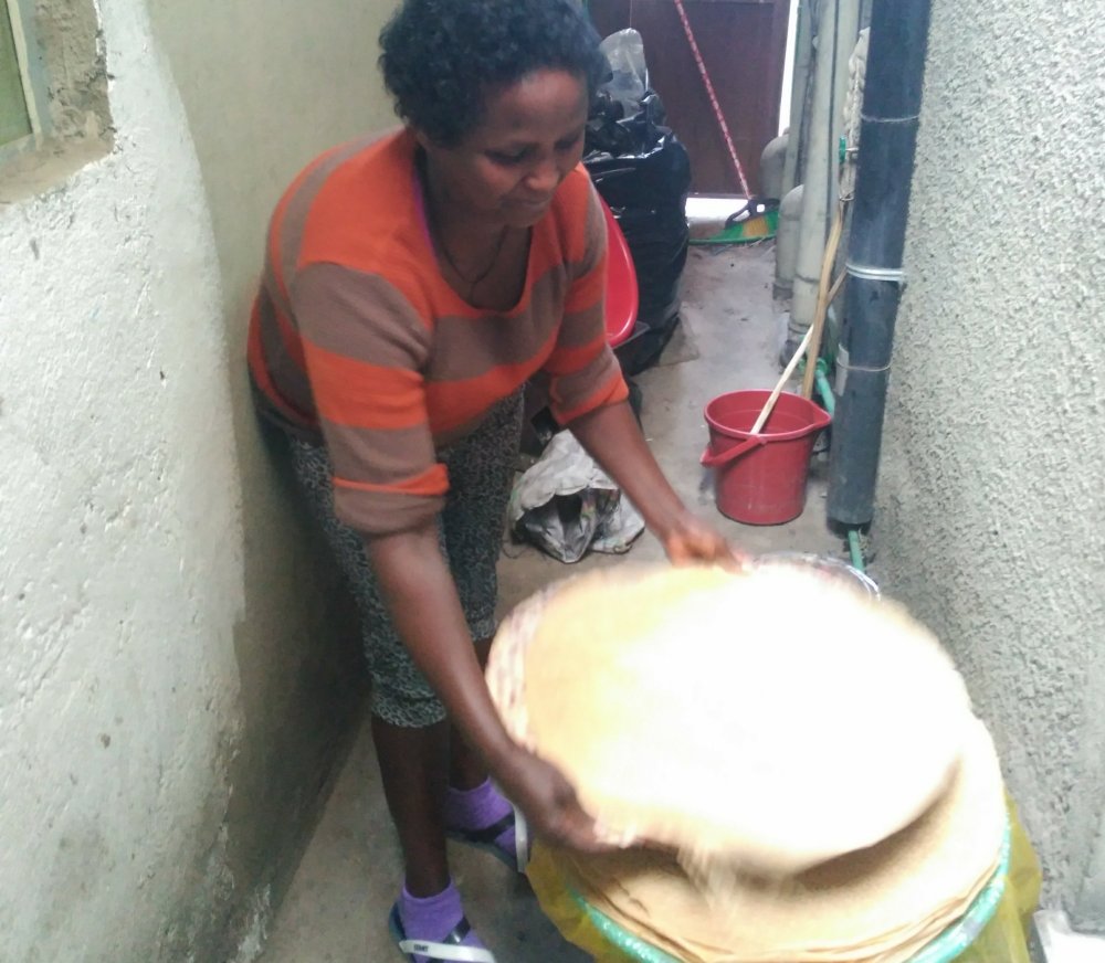 Egal, ich nehme ein Taxi zur Hochzeitsfamilie und werde wieder von allen einzeln herzlichst begrüßt. Sie wachsen mir langsam ans Herz. Dann darf ich im kleinen Hof hinter der Küche sehen, wie die traditionellen Ingera gemacht werden und sogar selber mitkochen.