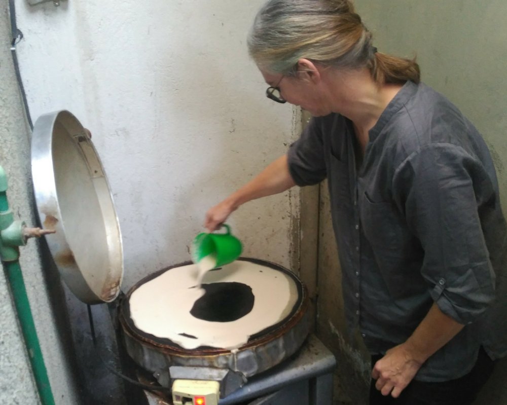 Der Sauerteig (aus Teff) wird schwungvoll von außen nach innen in die Spezialpfanne gegossen,