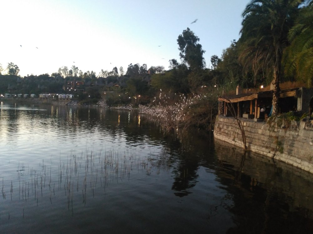Wir kommen an einem See mit Wellness-Resort an, wo man auch in die Umgebung wandern kann. Da wir alle keine geeigneten Schuhe dabeihaben und ohnehin hungrig sind, gehen wir (sehr lecker) essen – mit Blick auf den See und seine Scharen von Vögeln, die wie Blüten in den Sträuchern sitzen.
