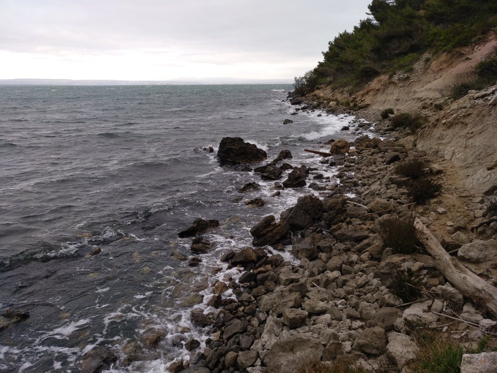 Ich bin so ein Schlaufuchs. Abends gucke ich mal nach der Bushaltestelle, damit ich weiß, welcher Bus mich am nächsten Tag nach der Wanderung nach Martigues zurückbringen wird. Die 29 ist es und sie fährt so ca. alle Stunde, auch an Samstagen und Schulferien (gibt nur zwei Kategorien im Fahrplan). Morgen ist schließlich Jour férié (Tag der Befreiung). Am nächsten Tag ist es bedeckt, fast schon regnerisch. Macht nichts, ich warte die Wölkchen ab und mache mich auf den sentier littoral (Küstenpfad). Die Wanderwege sind hier nicht immer so dolle gekennzeichnet, aber am Ufer entlang – das findet man ja immer. Sieht gut aus: