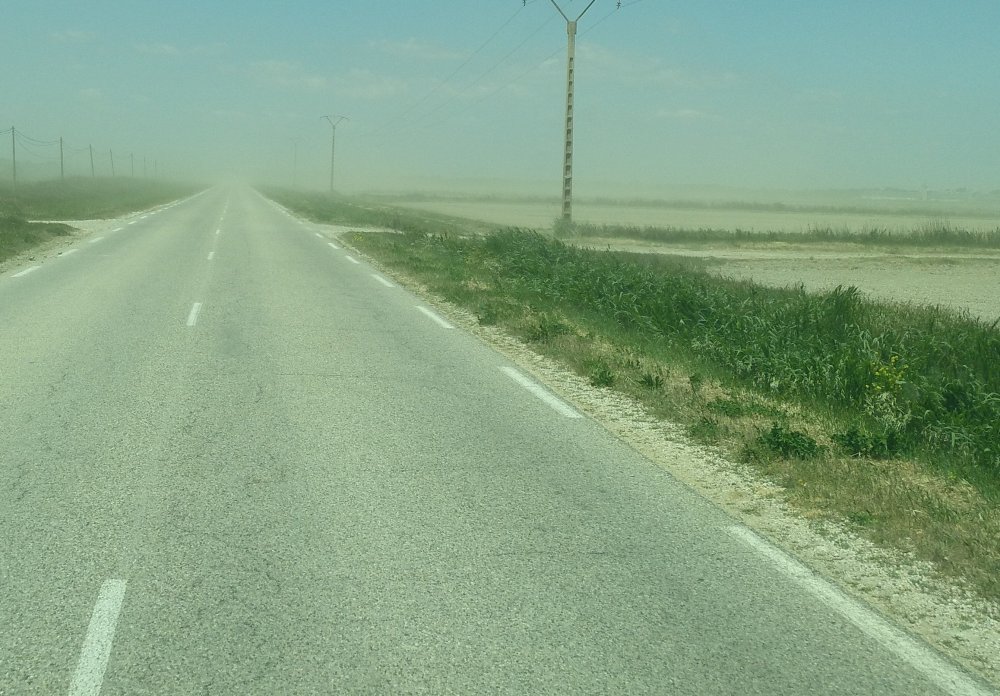 Der Wind fegt Erde vom Acker, die Straße versinkt im Staubnebel.