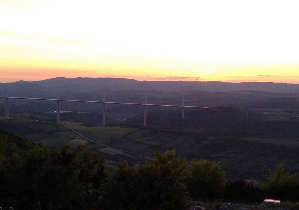 Dann ist da die neue Autobahnbrücke bei Millau, die man in einem gewaltigen Sonnenuntergangsspektakel von den Bergen über Creissels aus bestaunen kann.
