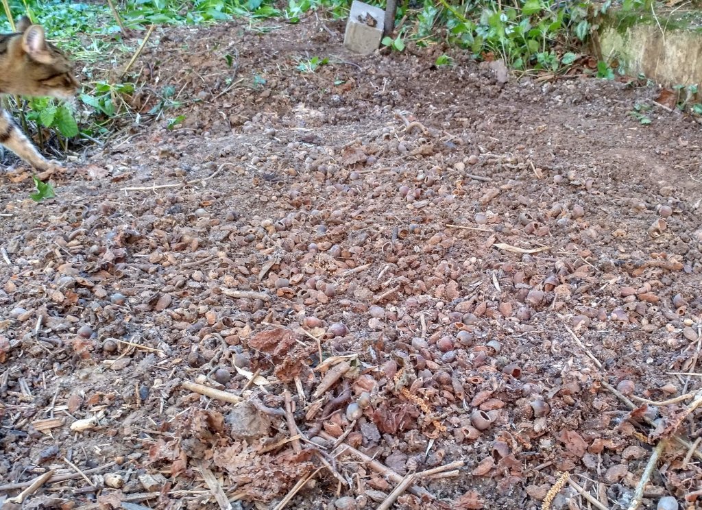Der staubtrockene Boden ist bedeckt von Nussschalen, darunter alles mauselochunterhöhlt. Sogar die Mietz macht ein langes Gesicht. Der Sohn schleppt grinsend ein Eisenkreuz weg: „Damit hab ich früher immer mein Floß festgemacht!“ Es kommt erstmal aufs Hasengrab. Jetzt an Papas Tod zu denken, ist mir zu morbid. Eine Woche ist es her.